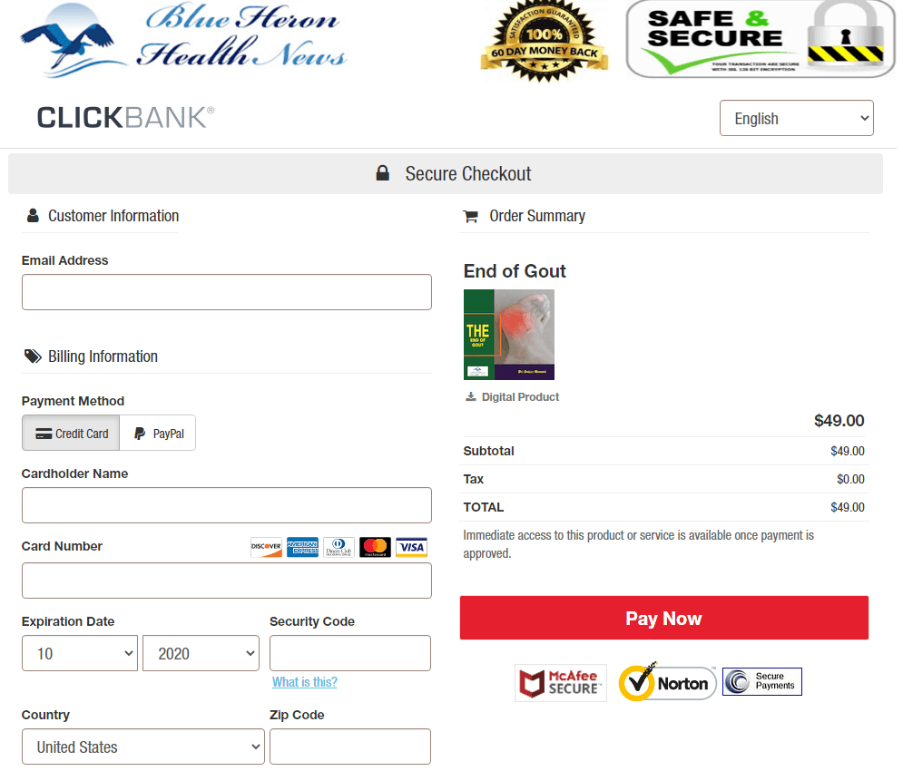 Refund Policy: If within the first 60 days of receipt you are not satisfied with The End of Gout™ , you can request a refund by sending an email to the address given inside the product and we will immediately refund your entire purchase price, with no questions asked.